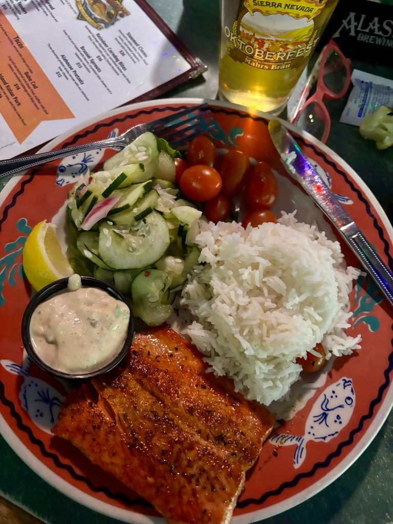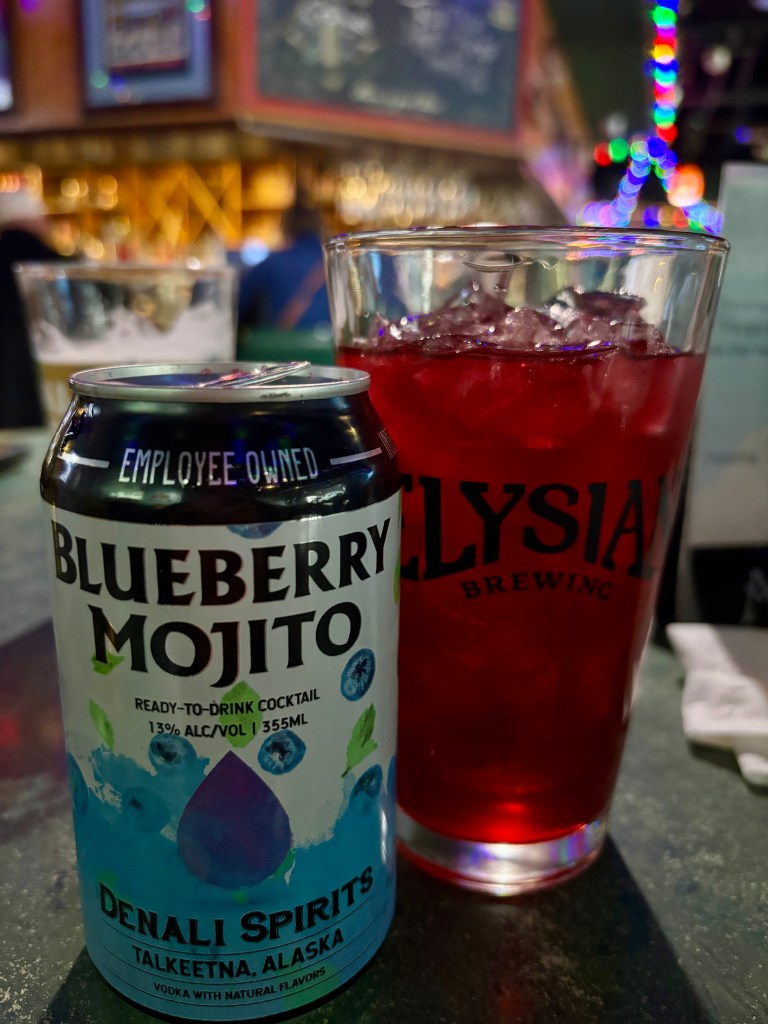 Our last stop was Humpy’s Great Alaskan Alehouse. A recommendation from one of our Lyft drivers. It did not disappoint. I had the salmon for dinner. It was delicious and not overcooked, as can happen with salmon. For my beverage, I tried the Denali Spirits Canned Blueberry Mojito, which I am now hooked on. Be warned, it has a 13% ABV! It would be refreshing to sip over ice with a twist of lime on a summer’s day.