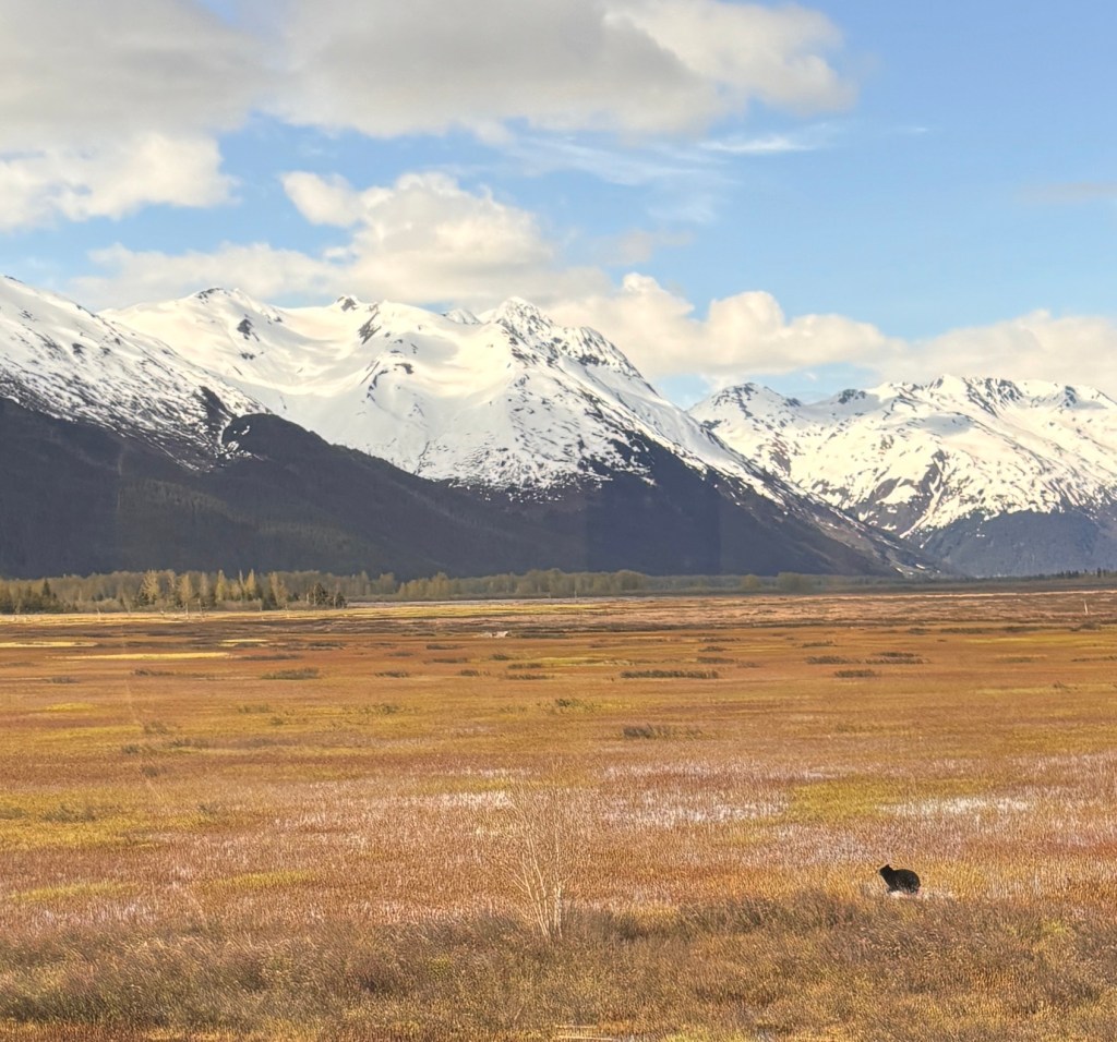 Late afternoon we are passing a meadow area near Turnagain Arm when we see a black bear. It stands up, looks at us and then runs away. I’m happy to have seen a bear, as I hadn’t seen one yet this year. (It’s small in the picture below).