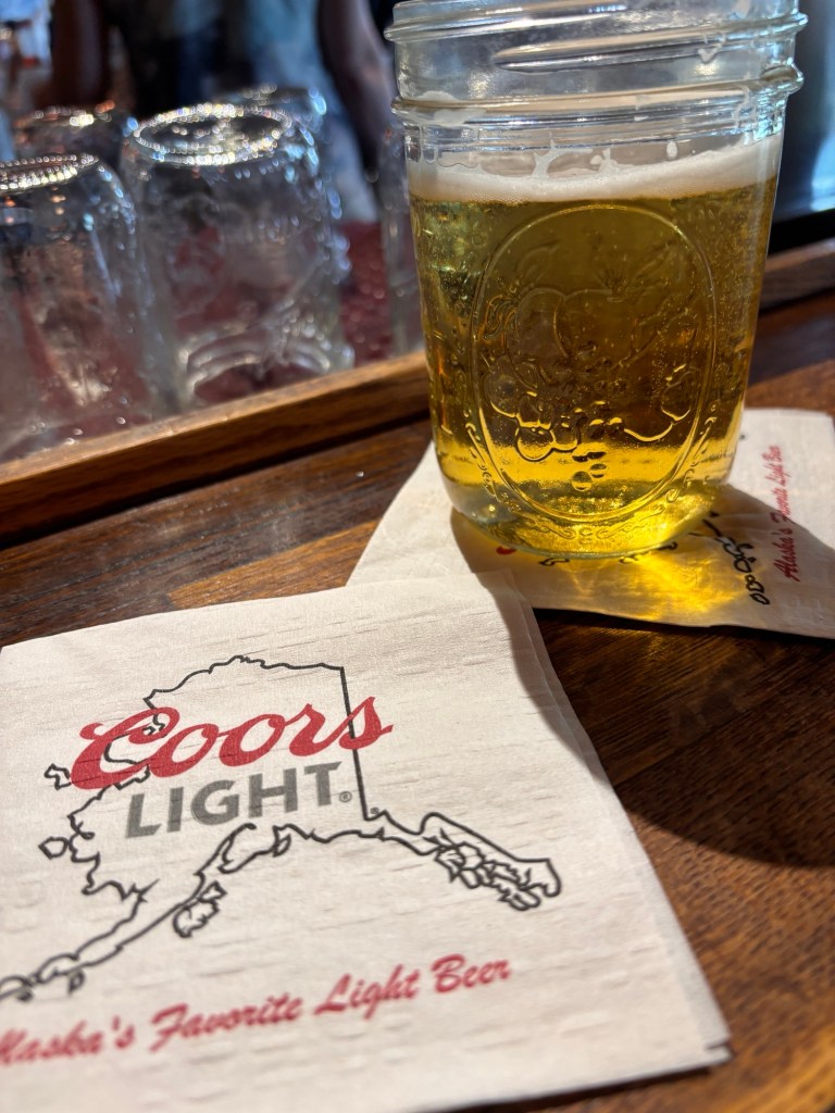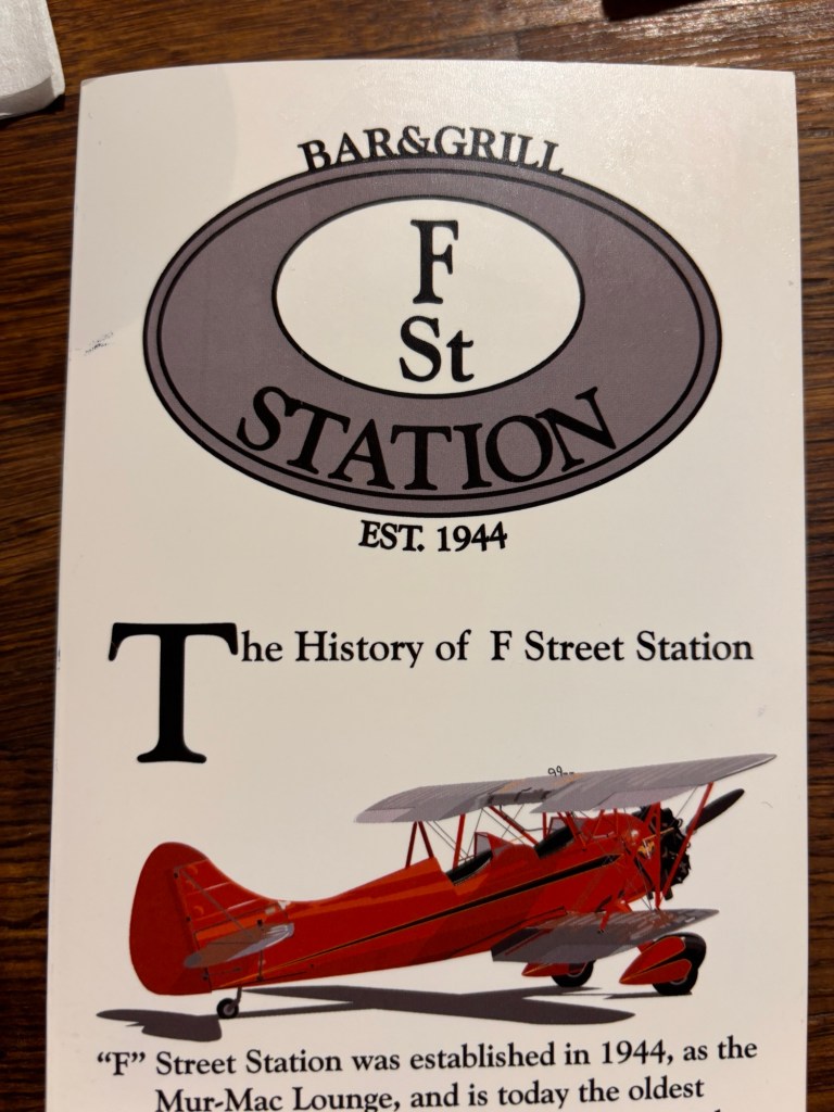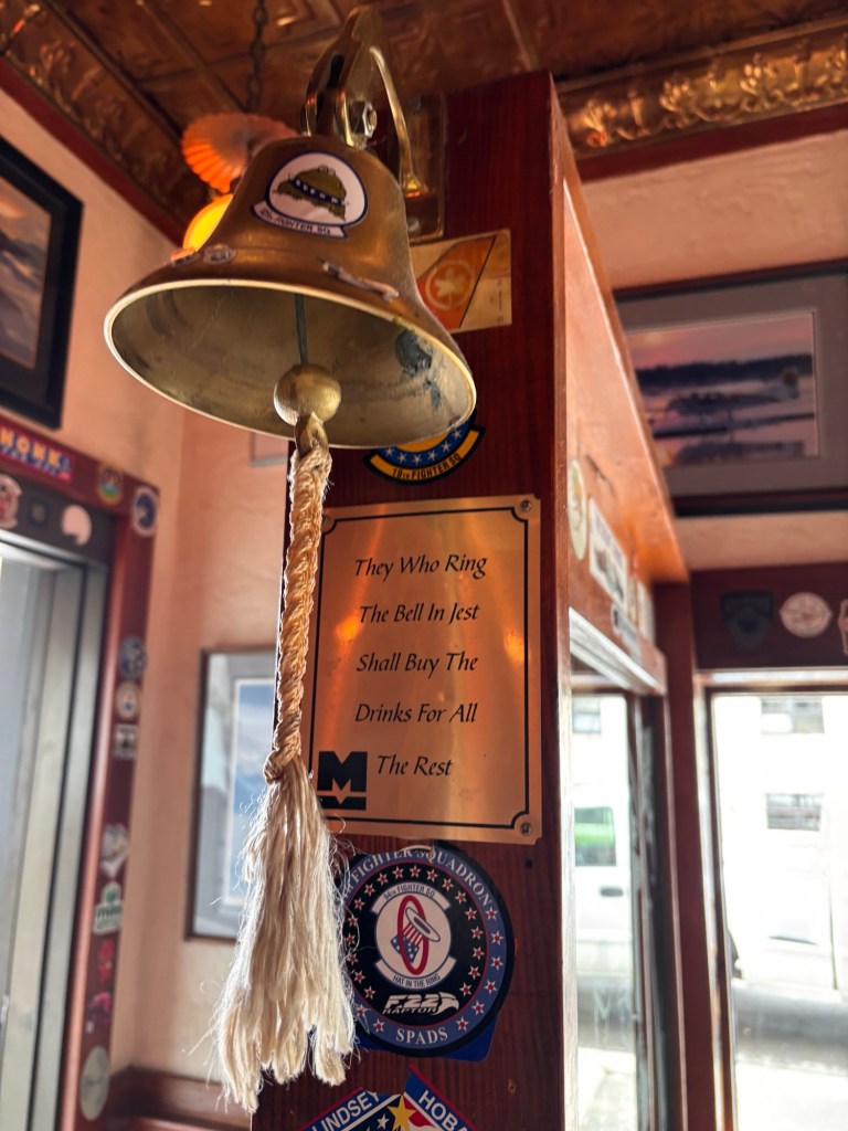 The food was delicious and the bar was bustling with activity. Every seat was filled. Stickers, mainly about airplanes, adorn the walls.