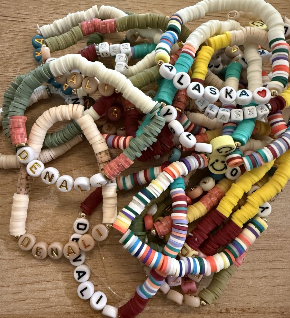 This year I had the idea to make Alaska specific ones. So I spent a month crafting bracelets that say “Alaska”, “Denali” and a few “YOLO” . I’m ADHD and sitting still is difficult. So it’s string beads or eat food lol!