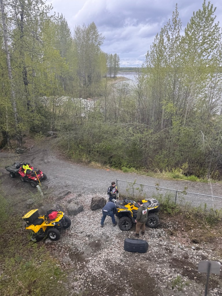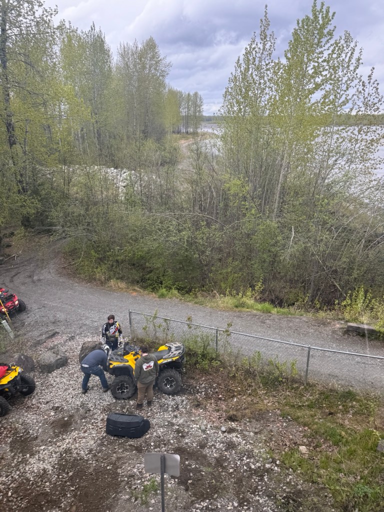I hear the horn blast, letting everyone know we are moving forward. We start to roll and I look out the right window and see the ATV. (Pictures included below). There are three men looking at the damage. Further in the distance are two more ATV’s. One holds a small child and on another one a woman.